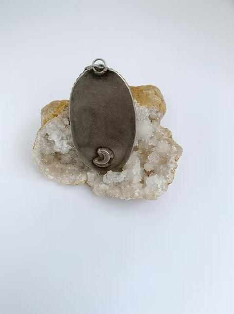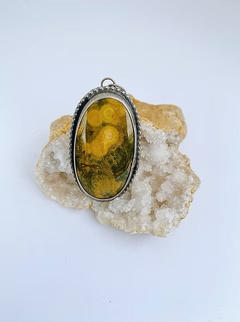 This gorgeous mustard coloured Ocean Jasper has a wee little crecent moon on the back. Part of the Coven Collection.