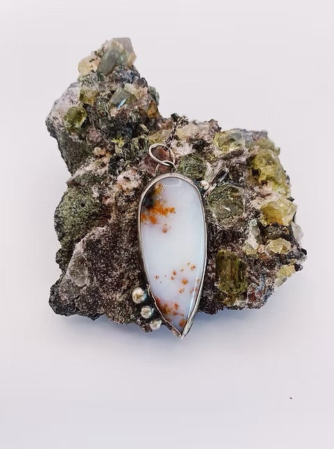 Milky dendritic flower agate with 4 recycled silver orbs.