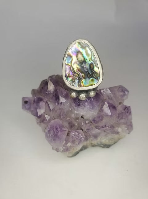 Abalone shell set in recycled sterling silver with a fancy band. Size 5.5