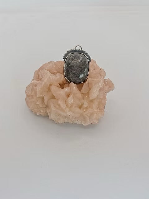 Fossilized coral with a small tattoo stamp on the back. Part of the Black and White Collection.