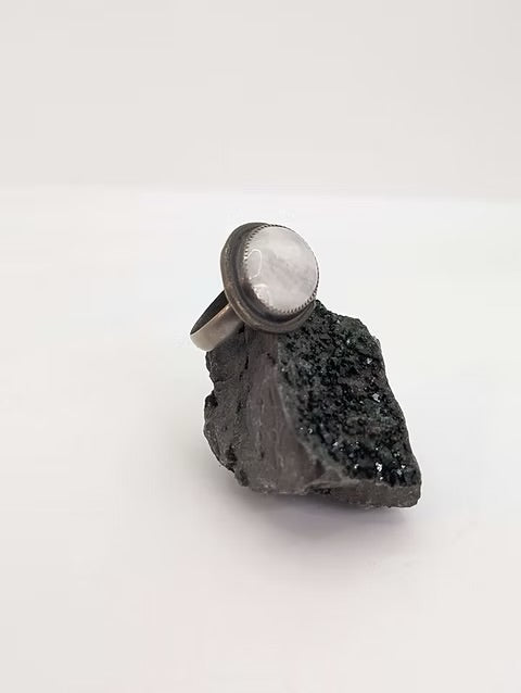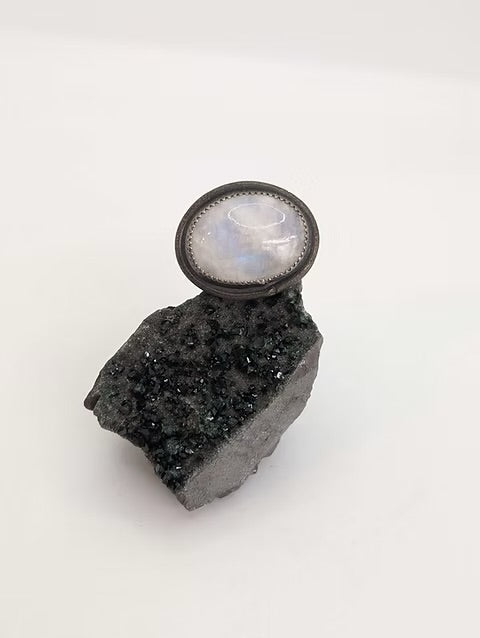 Stunning rainbow moonstone set in recycled sterling silver with brass adornments.